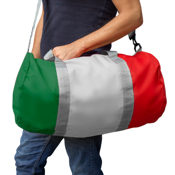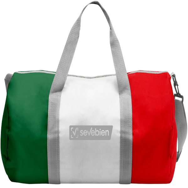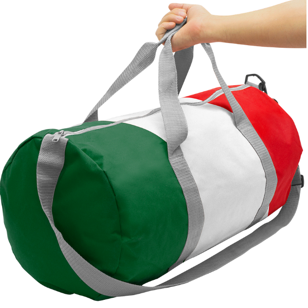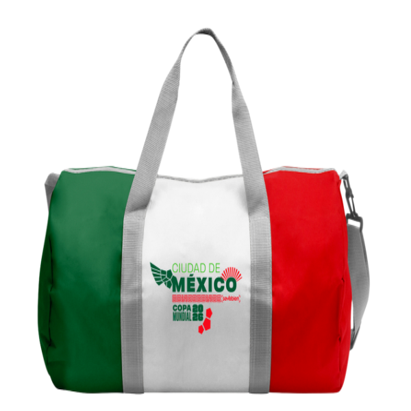 Bolso deportivo con los colores de la bandera mexicana. Amplio compartimento principal y cierre transversal en color gris. 2 asas y correa ajustable color gris.
