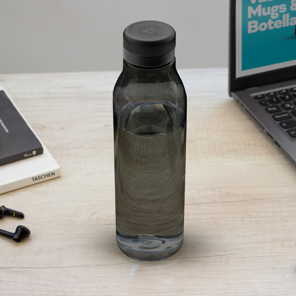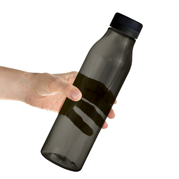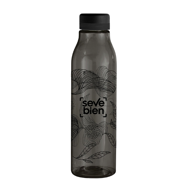 Botella de plástico color negro con tapa a rosca color negro mate con anillo de silicona de diferentes colores.