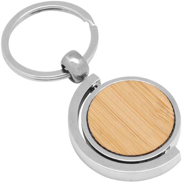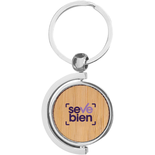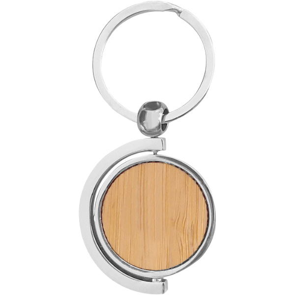 7,5 x 3,5 x 0,4 cm. Llavero circular de bambú con detalles metálicos. Estructura giratoria 360°. Presentación en caja de regalo.