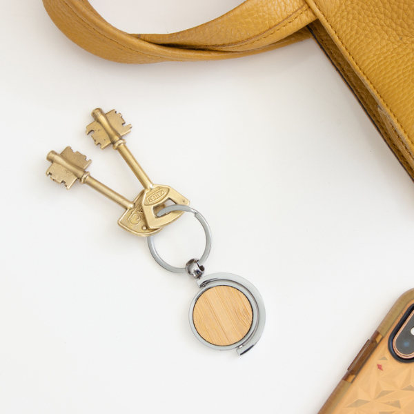 Llavero circular de bambú con detalles metálicos.