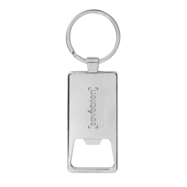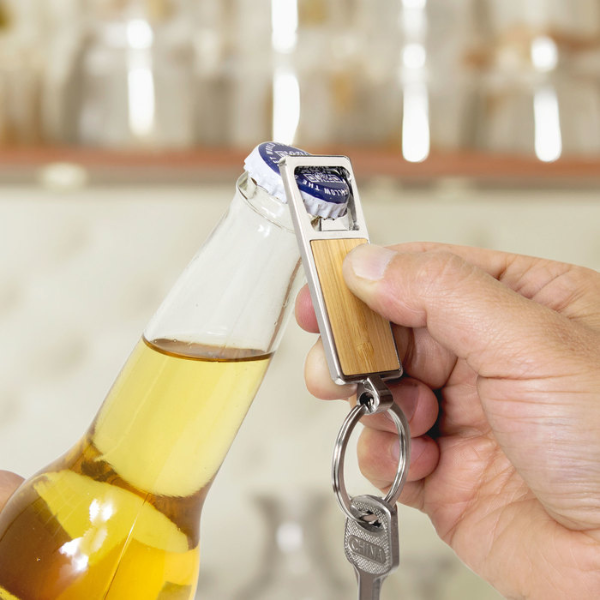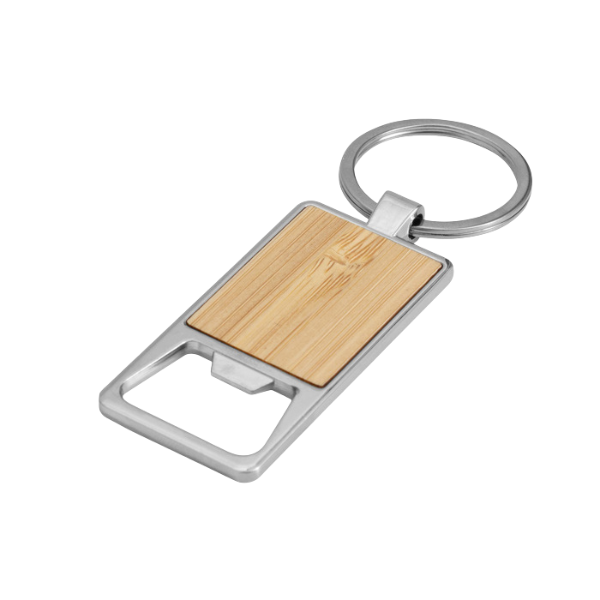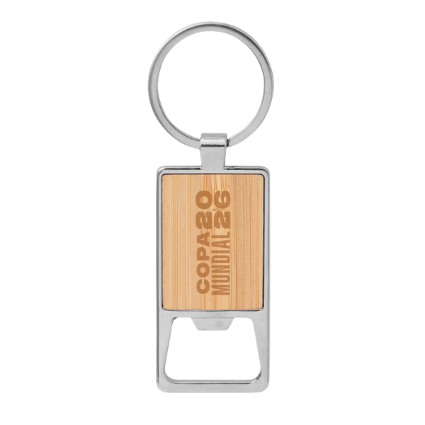 Llavero con destapador abre botellas. Estructura metálica con aleación de zinc con acabado brillante y panel frontal de bambú barnizado.