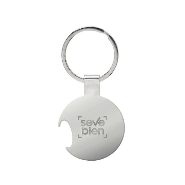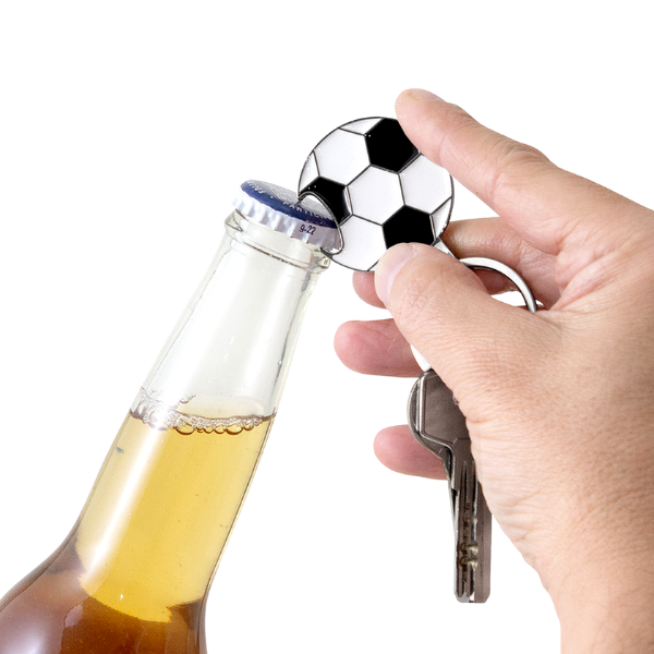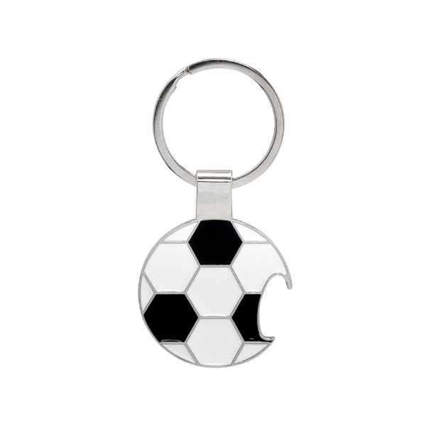 Llavero con destapador abre botellas. Estructura metálica con forma de pelota de fútbol pintada con esmalte brillante de colores negro y blanco.