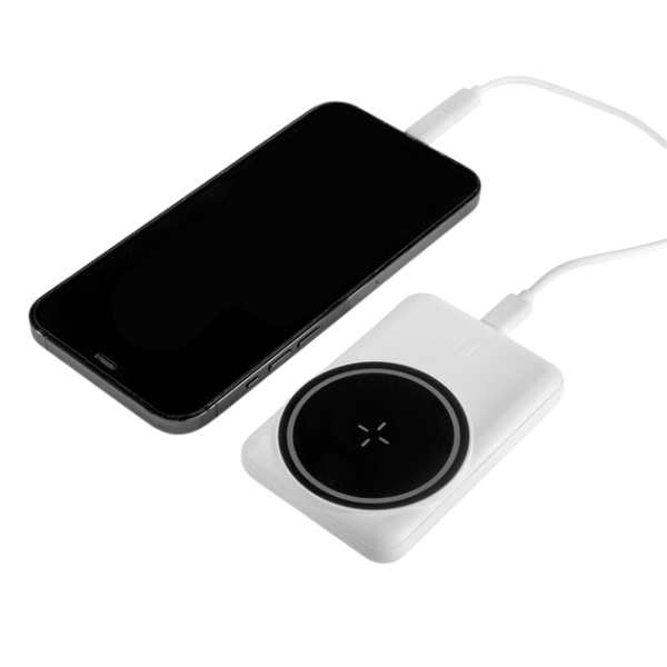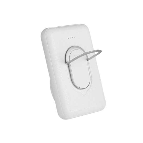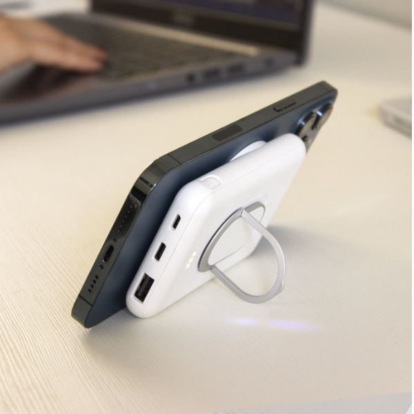 Power bank inalámbrico con aro magnético y soporte de anillo. Color blanco mate y negro brillante. Posee Entrada y salida: 5V 2A. Con 2 puertos de carga USB-C y micro USB. Función inalámbrica magnética. Potencia inalámbrica: 5W. Indicador luz led de carga. Soporte plateado rebatible al dorso. Cable de carga USB-C de 30 cm. en color blanco.