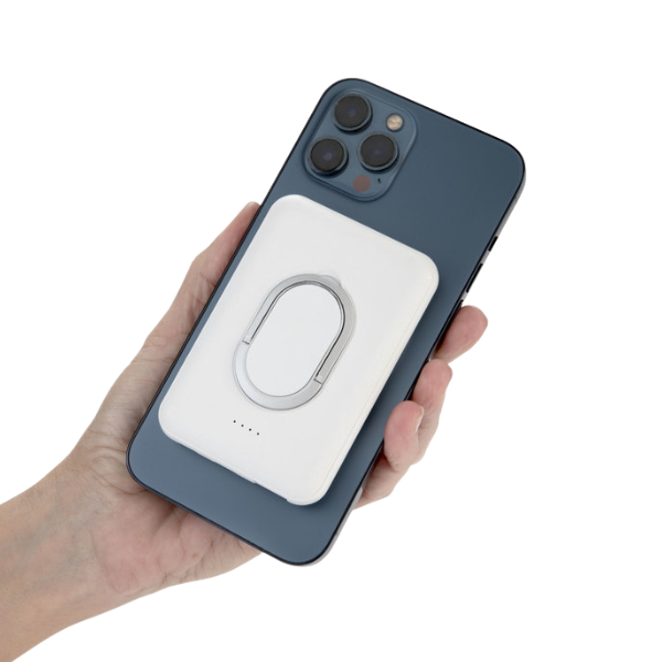 Power bank inalámbrico con aro magnético y soporte de anillo.