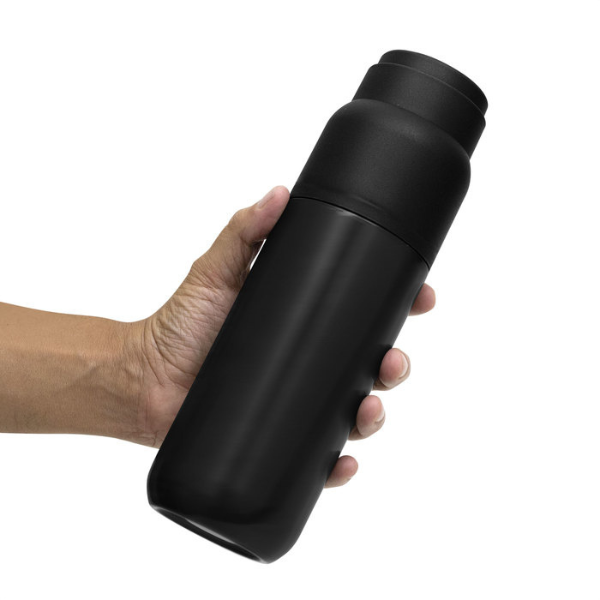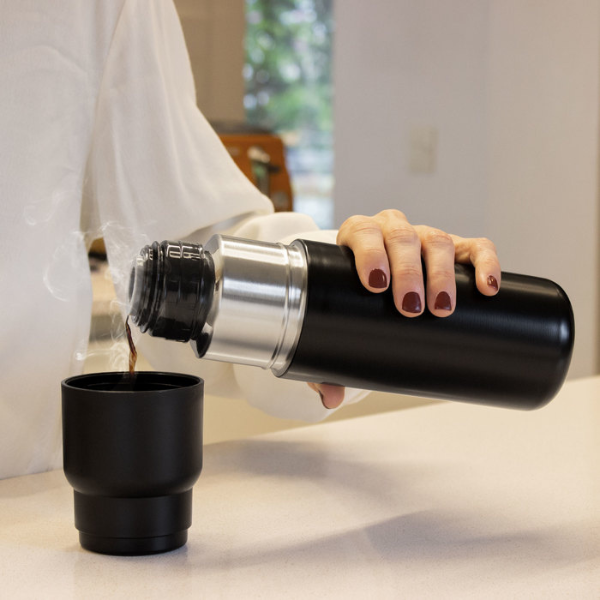 Termo con taza. Termo Doble pared sellado al vacío. Interior en acero 304 y exterior en acero 201. Tapa y taza plásticas a rosca color negro. Tapón con apertura y cierre a presión. Mantiene hasta 8 hs la temperatura de las bebidas calientes y hasta 12 hs la de las bebidas frías.